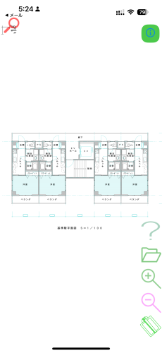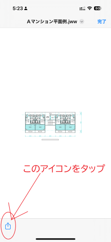 メールのプレビュー画面からファイルをファイルを転送するには以下の手順を行います。メールのプレビュー画面で左下のアイコンをタップします。